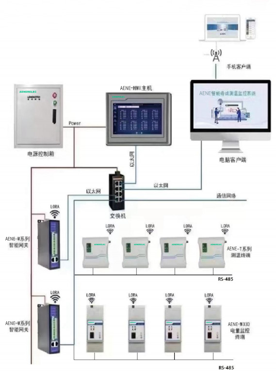 AENE-Busway 智能母線測溫監(jiān)控系統(tǒng),可將母線槽連接處的溫濕度, 以及始端箱 / 插接箱的電壓、電流、功率、開關(guān)狀態(tài)量、諧波、溫度等信息通 過智能網(wǎng)關(guān)上傳到智能 HMI 觸摸屏或主站后臺(tái)監(jiān)控系統(tǒng)當(dāng)中,同時(shí)支持手機(jī) APP 掌上運(yùn)維。
